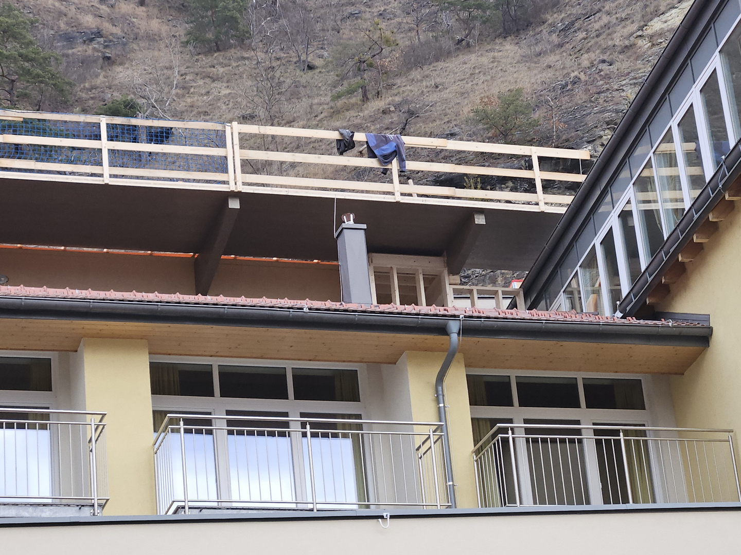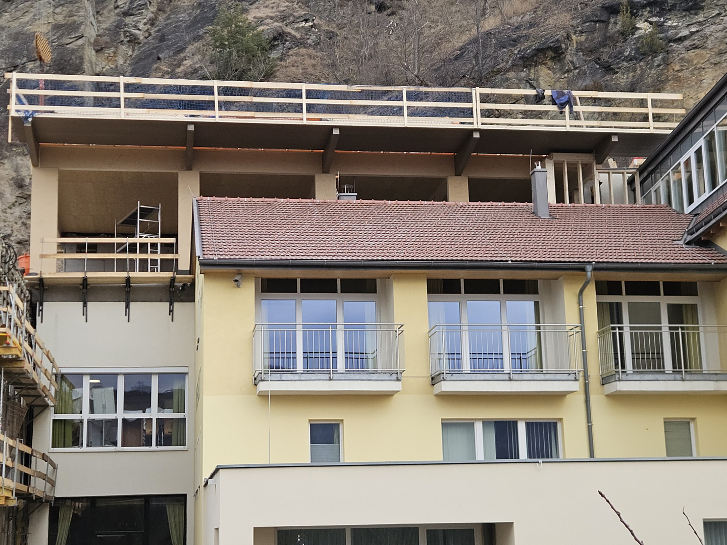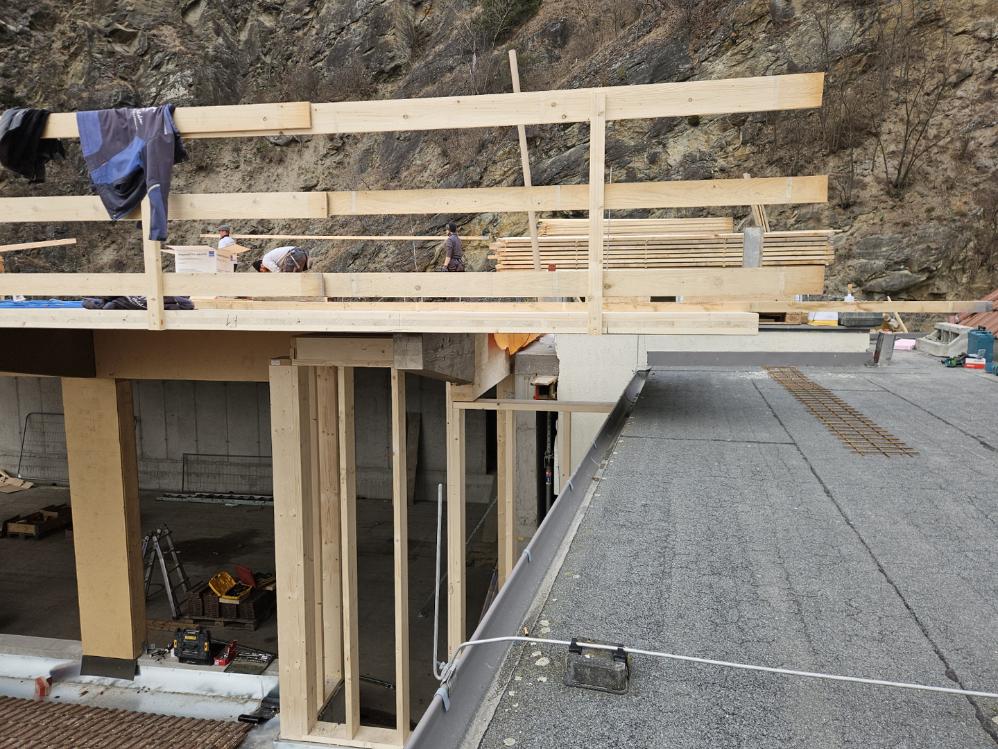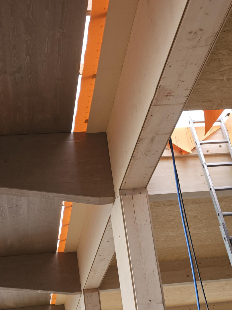 Es entsteht ein Ruheraum und Gästezimmer, die mit vorgefertigten Dachelementen auf Leimholzträger aufliegen und überdacht werden. Der südliche Dachvorsprung ist mit Kreuzlagenholzelementen hergestellt. Im vorletzten Geschoß ist ein Steildach mit sichtbaren Sparren geplant.