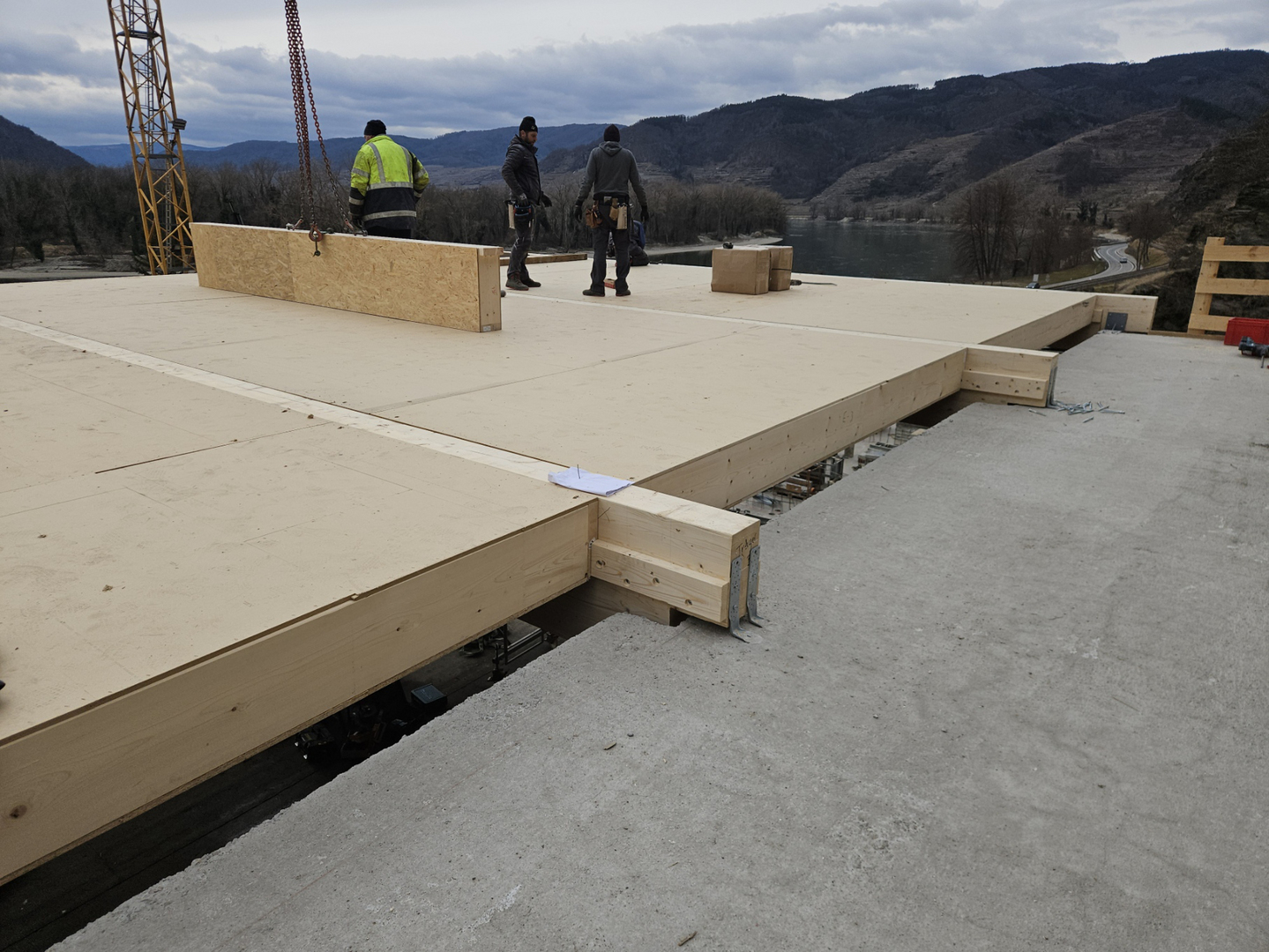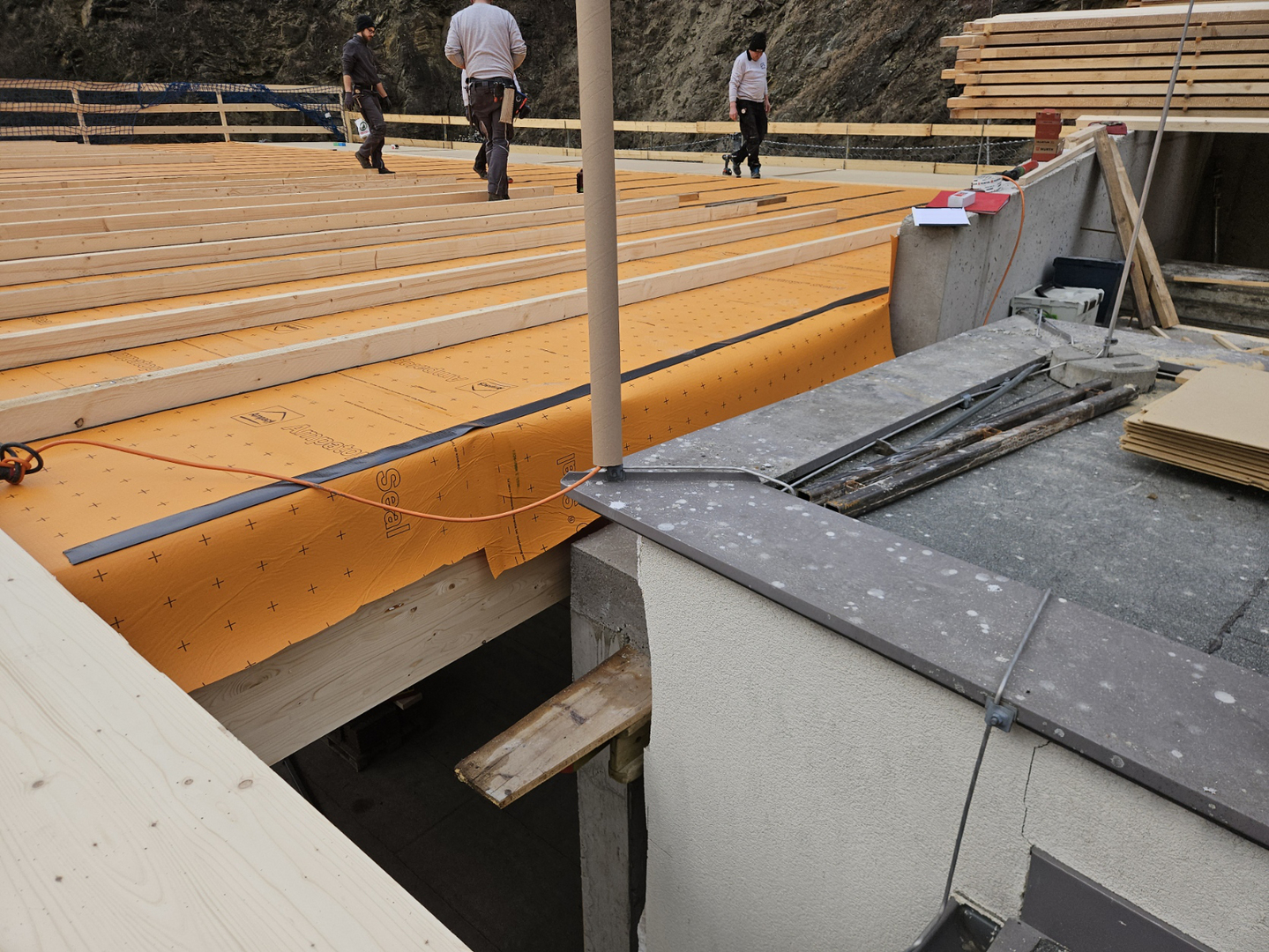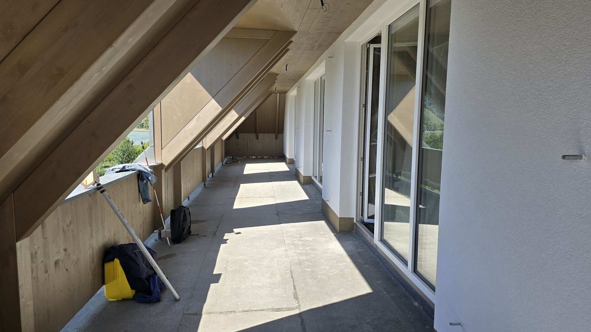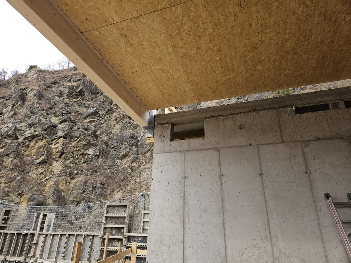 Es entsteht ein Ruheraum und Gästezimmer, die mit vorgefertigten Dachelementen auf Leimholzträger aufliegen und überdacht werden. Der südliche Dachvorsprung ist mit Kreuzlagenholzelementen hergestellt. Im vorletzten Geschoß ist ein Steildach mit sichtbaren Sparren geplant.