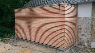 Der Zubau der Scheune ist mit einer Lärchen-rautenschalung verkleidet und es wurde ein flächenbündiges Fassadentor montiert.