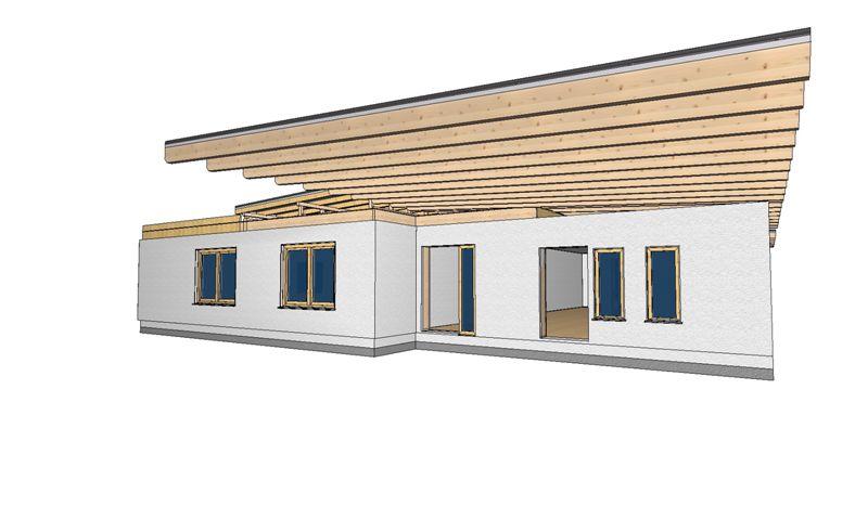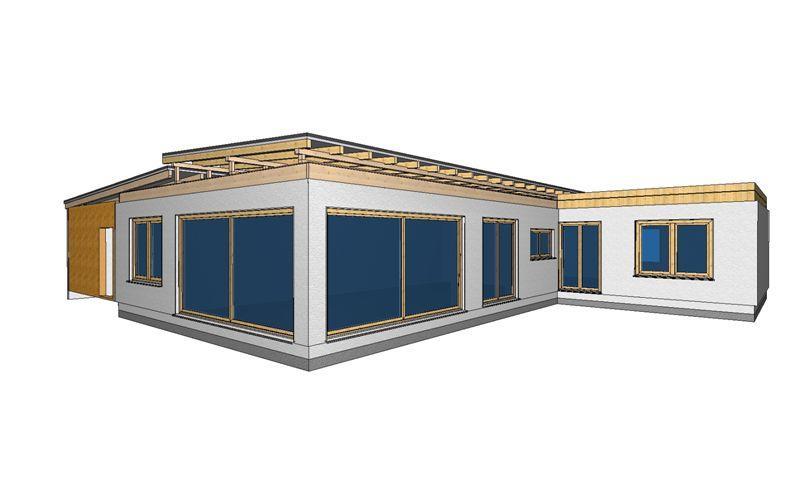 Einfamilienhaus auf einer Ebene mit großzügig gestalteten Fensterfronten im Süden. Neben der überdachten Pergola ist ein Pool geplant.