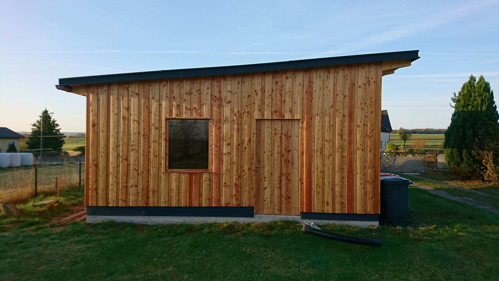 Das Carport bietet Platz für zwei Autos und hat einen Abstellraum angefügt. Die Verschalung wurde mit Fichtenholzbretter ausgeführt.