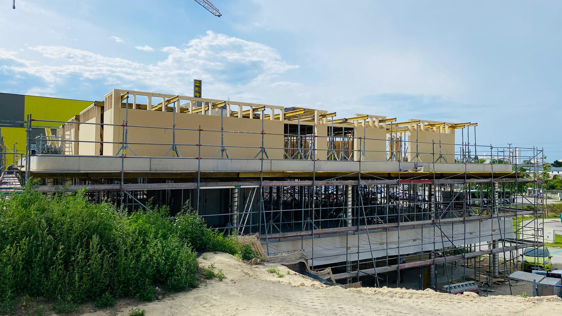 Die im Erdgeschoß montierte Pfostenriegelkonstruktion wurde mit unserer CNC Anlage hergestellt. Die Außen-fassade im Obergeschoß ist aus 3-Schicht-Platten mit vorgesetzen Lärchenstaffeln. Die Fenster sind in Fichtenholz mit einer 3-fach Verglasung ausgeführt.