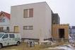Das Passivwohnhaus mit Arztpraxis wurde mit vorgefertigten Bauteilen in Holzriegelkonstruktion errichtet und mit Strohballen ausgefacht.